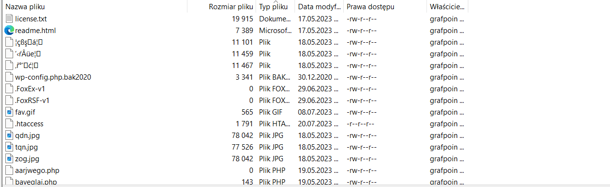 Zalogowałem się przez FTP i znalazłem podejrzane pliki i foldery, m.in. o losowych, niezrozumiałych nazwach („26sos5p7”, „FoxEx-v1” i inne). Te pliki sugerowały ingerencję z zewnątrz i wymagały natychmiastowego usunięcia (bez pobierania na lokalny komputer).