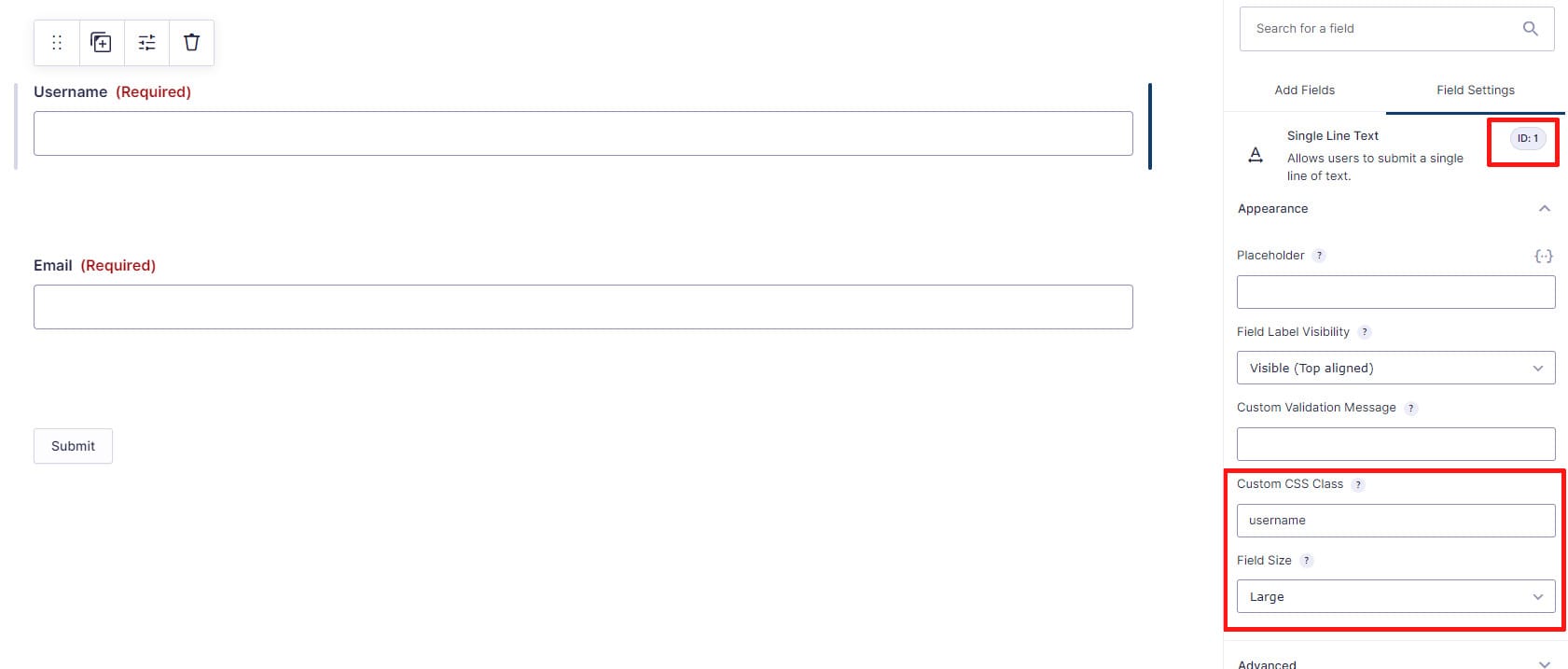 - Assign username CSS class to the first field, assign the email CSS class to the second field.