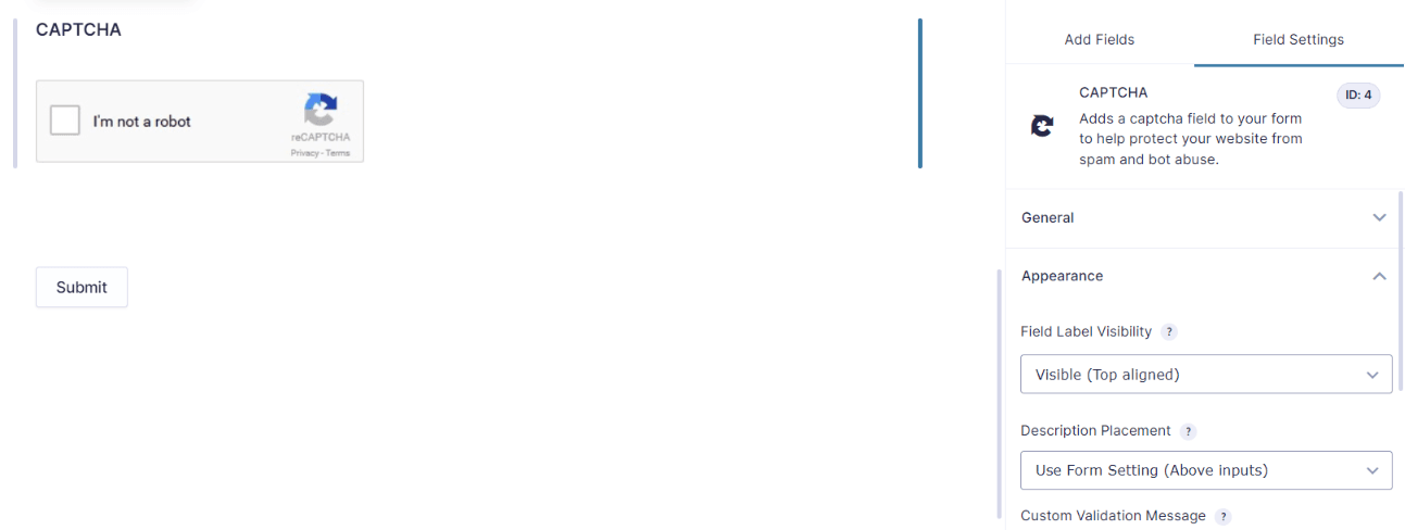 The CAPTCHA field allows you to add a captcha field to your form, to help protect your website from spam and bot abuse by trying to determine if the form is being submitted by a human, or defeating a form submission attempt by a scripted bot. The Gravity Forms Captcha field is available under the Advanced Fields section within the form editor.