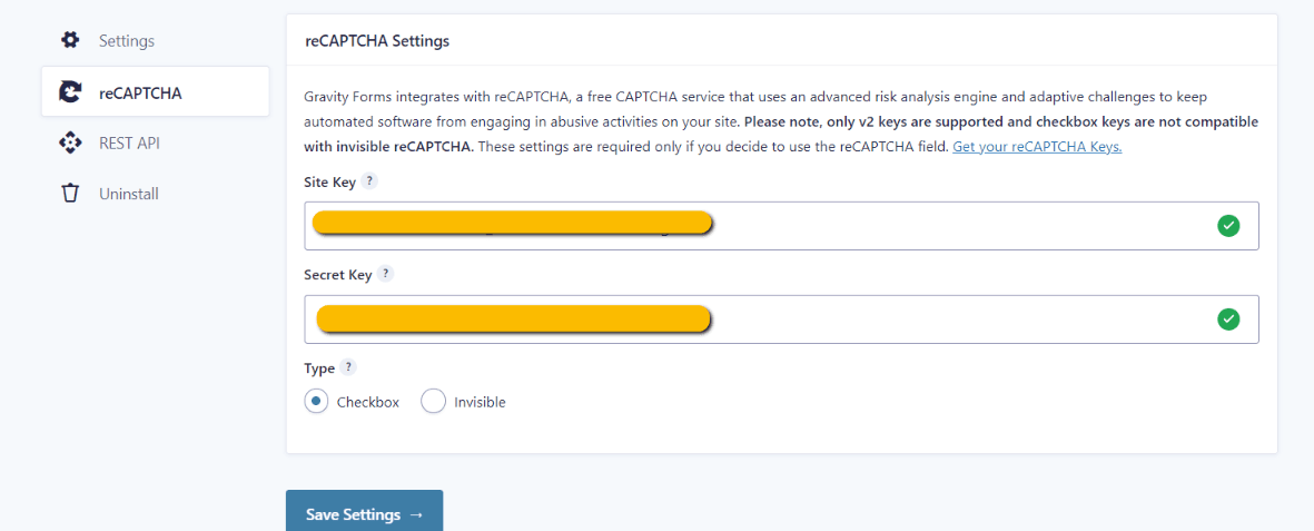 Another, default interesting feat of Gravity Forms is its Captcha Field. Gravity Forms integrates seemlessly with reCaptcha v2 service allowing us to reduce SPAM content, submissions made by bots etc.
